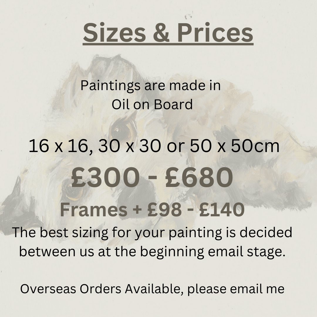 It’s always best to begin this lovely process by emailing me with a couple of photographs of your dog. This way, I can check that I can paint your dog as there are one or two breeds that I struggle with. If you can add in your dogs age, breed (as much as you know it) and name - all the better. (Email Sam Here)